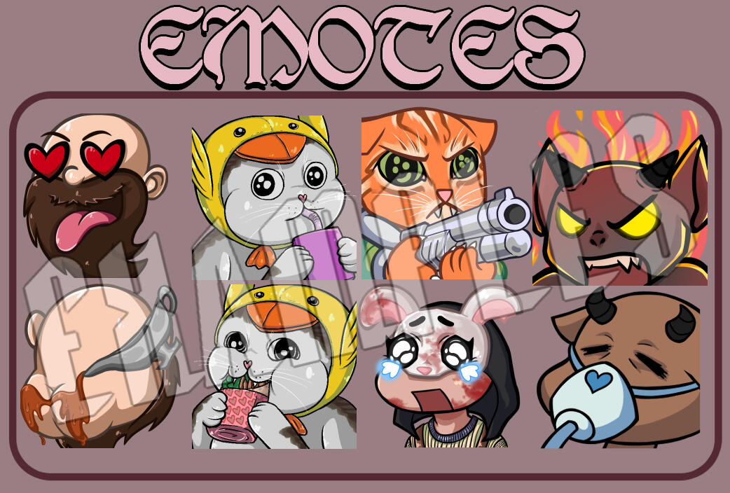 If you feel your stream or discord server is lacking some pizzazz, emotes are a perfect and fun way to get more engagement and add a personal touch to your brand! ♡ With your brilliant mind and my pen, I'm sure we can come up with the perfect little mascot to show how you really feel.__SLOTS:__
